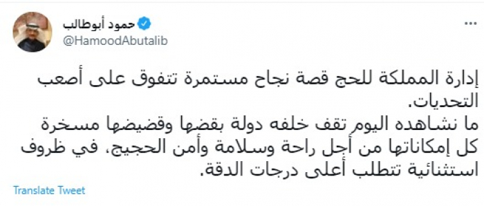 وقال في تغريدة عبر "تويتر" رصدها "المشهد العربي": "إدارة المملكة للحج قصة نجاح مستمرة تتفوق على أصعب التحديات".