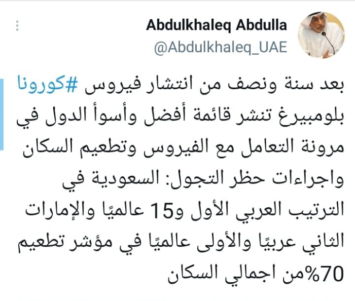 وكشف أن التقرير انتهى إلى أن: "السعودية في الترتيب العربي الأول و15 عالميًا، والإمارات الثاني عربيًا والأولى عالميًا في مؤشر تطعيم 70% من إجمالي السكان".