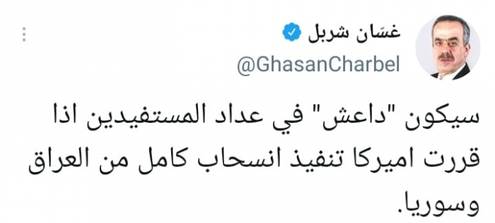 وشدد في تغريدة على حسابه بموقع التدوين المصغر تويتر، اليوم على أنه: "سيكون (داعش) في عداد المستفيدين إذا قررت أميركا تنفيذ انسحاب كامل من العراق وسوريا".