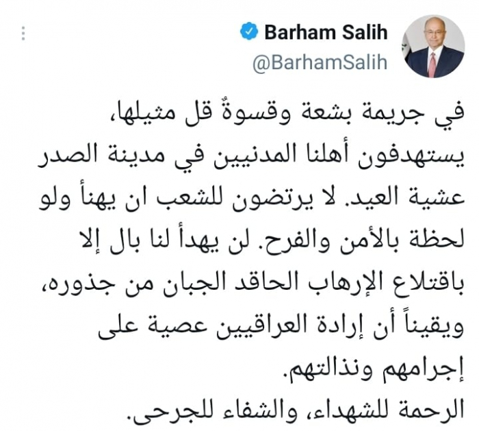 وصف الرئيس العراقي برهم صالح، التفجير الإرهابي في مدينة الصدر بأنه جريمة بشعة، مستنكرا استهداف الأبرياء عشية عيد الأضحى المبارك.