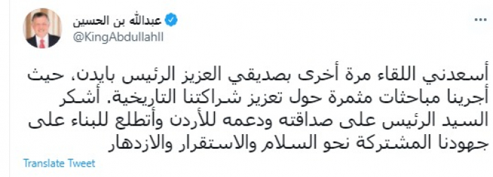 وأضاف: "أشكر السيد الرئيس على صداقته ودعمه للأردن وأتطلع للبناء على جهودنا المشتركة نحو السلام والاستقرار والازدهار".