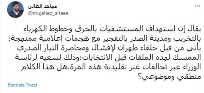 وكتب في تغريدة عبر "تويتر" رصدها "المشهد العربي": "يقال إن استهداف المستشفيات بالحرق وخطوط الكهرباء بالتخريب ومدينة الصدر بالتفجير مع هجمات إعلامية ممنهجة".