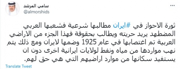 وقال في تغريدة عبر "تويتر" رصدها "المشهد العربي": "ثورة الأحواز في إيران مطالبها شرعية فشعبها العربي المضطهد يريد حريته ويطالب بحقوقة فهذا الجزء من الأراضي العربية تم اغتصابها في عام 1925 وضمها لإيران".