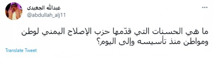 وقال في تغريدة عبر "تويتر" رصدها "المشهد العربي": "ما هي الحسنات التي قدّمها حزب الإصلاح اليمني لوطن ومواطن منذ تأسيسه وإلى اليوم؟".
