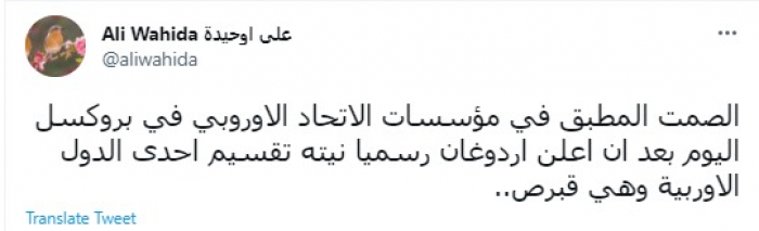 وقال في تغريدة عبر "تويتر" رصدها "المشهد العربي": "الصمت المطبق في مؤسسات الاتحاد الاوروبي في بروكسل اليوم بعد أن أعلن أردوغان رسميًا نيته تقسيم إحدى الدول الأوربية وهي قبرص".