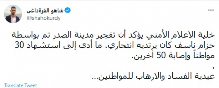 علق الكاتب الصحفي العراقي شاهو القرةداغي، اليوم الثلاثاء، على مجزرة الصدر في العراق.