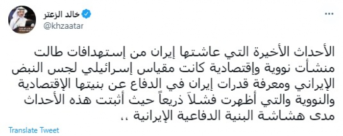 وكتب في تغريدة عبر "تويتر" رصدها "المشهد العربي": "الأحداث الأخيرة التي عاشتها إيران من استهدافات طالت منشأت نووية واقتصادية كانت مقياس إسرائيلي لجس النبض الإيراني ومعرفة قدرات إيران في الدفاع عن بنيتها الإقتصادية والنووية".