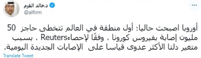 وقال في تغريدة عبر "تويتر" رصدها "المشهد العربي": "أوروبا اصبحت حاليا؛ أول منطقة في العالم تتخطى حاجز 50 مليون إصابة بفيروس كورونا ، وفقًا لإحصاءReuters ، بسبب متغير دلتا الأكثر عدوى قياسا على الإصابات الجديدة اليومية".