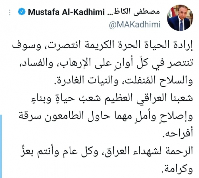 وقال في تغريدة على حسابه بموقع التدوين المصغر تويتر، اليوم إن: "إرادة الحياة الحرة الكريمة انتصرت، وسوف تنتصر في كلّ أوانٍ على الإرهاب، والفساد، والسلاح المُنفلت، والنيات الغادرة".