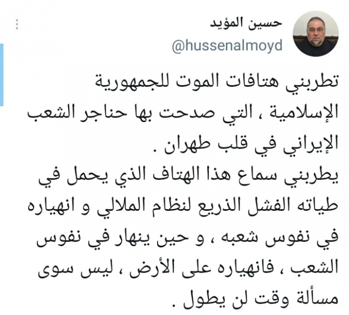 أكد الناشط السياسي حسين المؤيد، أن الشعب الإيراني يهتف بالموت للجمهورية الإسلامية، في إشارة إلى نظام ولاية الفقيه.