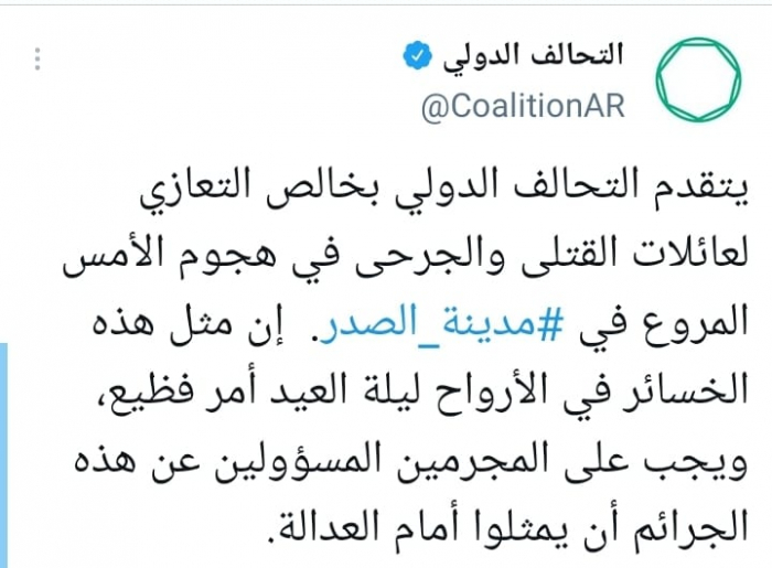 وقال في تغريدة على حسابه بموقع التدوين المصغر تويتر، اليوم إنه: "يتقدم التحالف الدولي بخالص التعازي لعائلات القتلى والجرحى في هجوم الأمس المروع في مدينة الصدر".