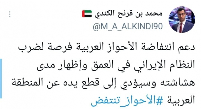 ودعا في تغريدة على حسابه بموقع التدوين المصغر تويتر، اليوم إلى: "دعم انتفاضة الأحواز العربية"، مؤكدا أنها: "فرصة لضرب النظام الإيراني في العمق".