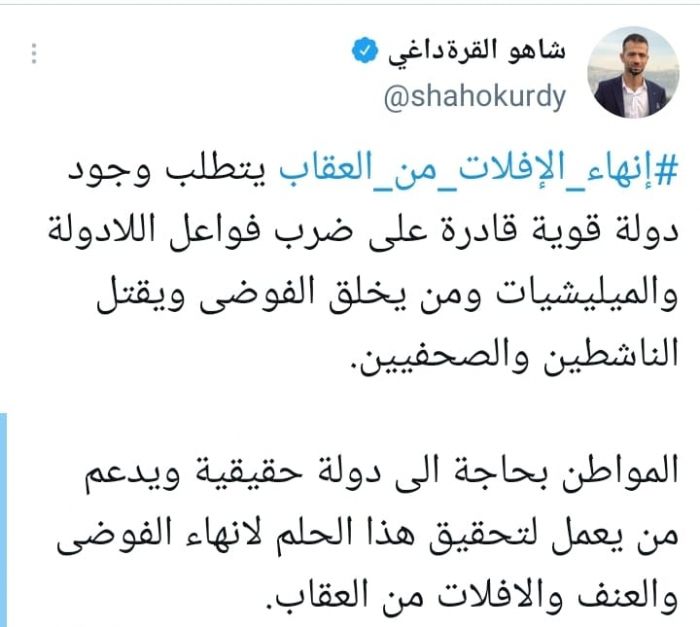 وأوضح في تغريدة على حسابه بموقع التدوين المصغر تويتر، اليوم أن: "إنهاء الإفلات من العقاب يتطلب وجود دولة قوية قادرة على ضرب فواعل اللادولة والميليشيات ومن يخلق الفوضى ويقتل الناشطين والصحفيين".