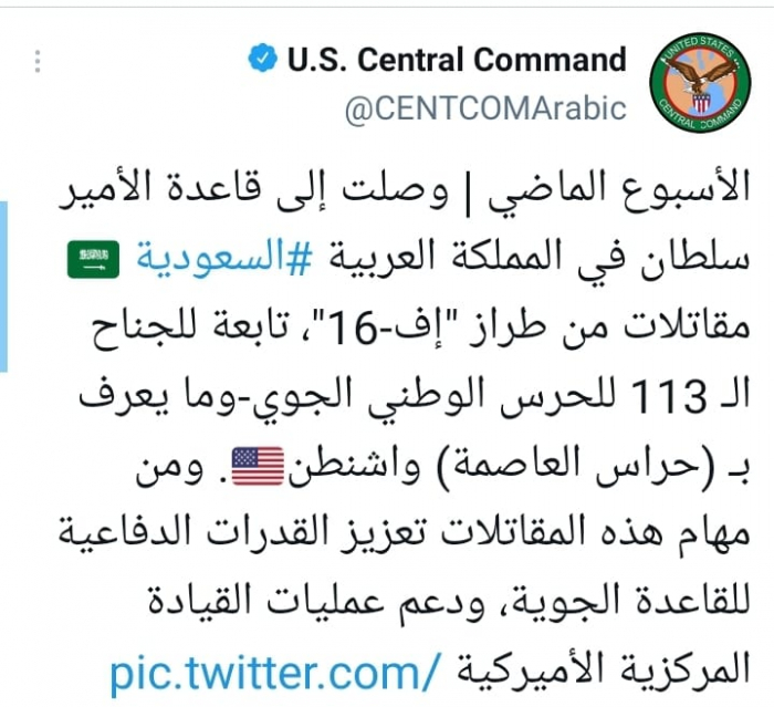 وأكد في تغريدة على حسابه بموقع التدوين المصغر تويتر، اليوم أن: "الأسبوع الماضي، وصلت إلى قاعدة الأمير سلطان في المملكة العربية السعودية مقاتلات من طراز (إف-16)، تابعة للجناح الـ 113 للحرس الوطني الجوي - وما يعرف بـ (حراس العاصمة) واشنطن.