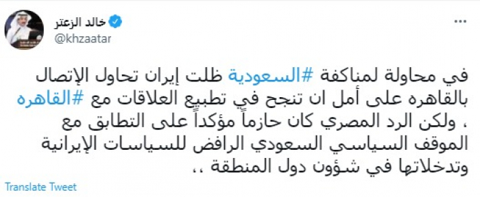 وقال في تغريدة عبر "تويتر" رصدها "المشهد العربي": "في محاولة لمناكفة السعودية ظلت إيران تحاول الاتصال بالقاهرة على أمل ان تنجح في تطبيع العلاقات مع القاهرة".