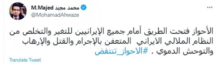 وكتب في تغريدة عبر "تويتر" رصدها "المشهد العربي": "الأحواز فتحت الطريق أمام جميع الإيرانيين للتغير والتخلص من النظام الملالي الإيراني المتعفن بالإجرام والقتل والإرهاب والتوحش الدموي.. الأحواز تنتفض".