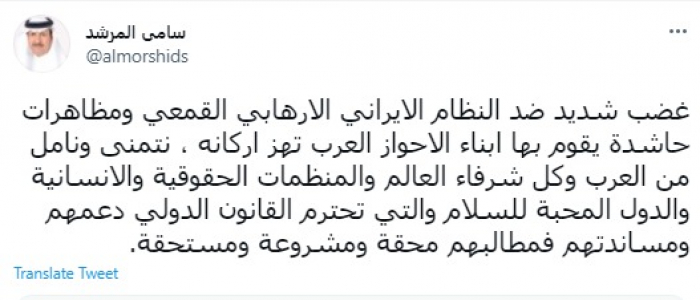 وقال في تغريدة عبر "تويتر" رصدها "المشهد العربي": "غضب شديد ضد النظام الإيراني الإرهابي القمعي ومظاهرات حاشدة يقوم بها أبناء الأحواز العرب تهز أركانه".