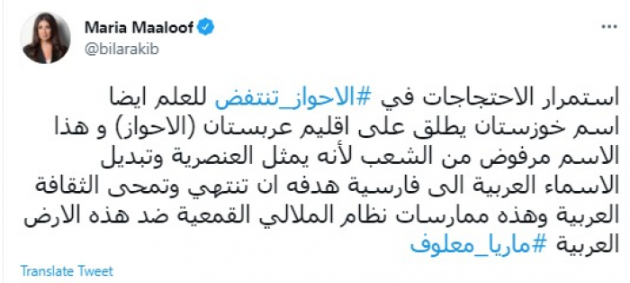 وقالت في تغريدة عبر "تويتر" رصدها "المشهد العربي": "استمرار الاحتجاجات في الأحواز تنتفض للعلم أيضًا اسم خوزستان يطلق على إقليم عربستان (الأحواز) وهذا الاسم مرفوض من الشعب لأنه يمثل العنصرية".