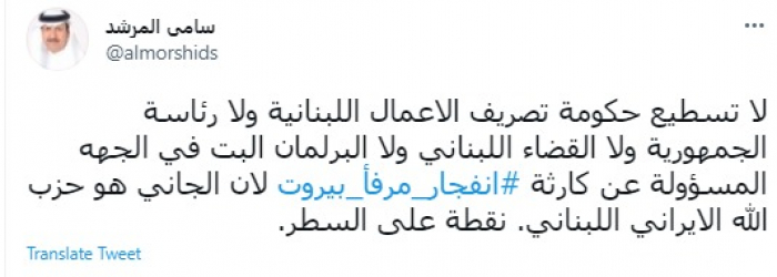 وكتب في تغريدة عبر "تويتر" رصدها "المشهد العربي": "لا تسطيع حكومة تصريف الأعمال اللبنانية ولا رئاسة الجمهورية ولا القضاء اللبناني ولا البرلمان البت في الجهه المسؤولة عن كارثة انفجار مرفأ بيروت لأن الجاني هو حزب الله الإيراني اللبناني. نقطة على السطر".