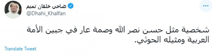 وقال في تغريدة عبر "تويتر" رصدها "المشهد العربي": "شخصية مثل حسن نصر الله وصمة عار في جبين الأمة العربية ومثيله الحوثي".