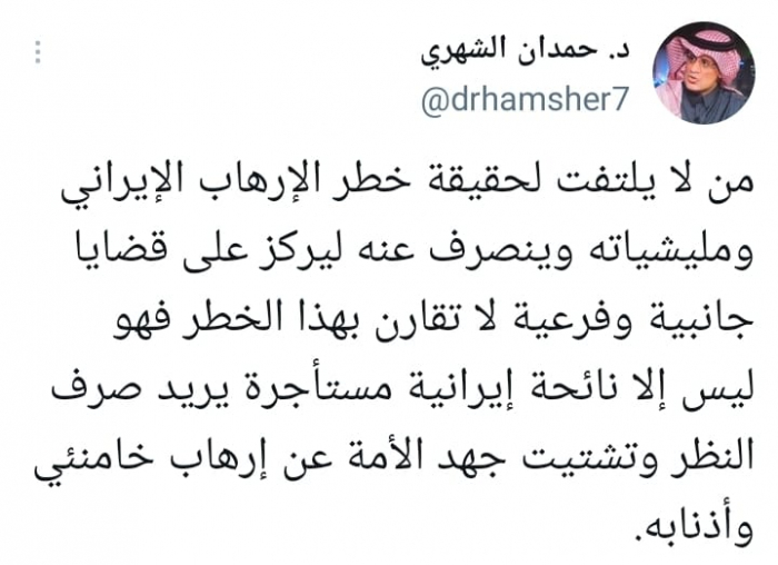 وأكد في تغريدة على حسابه بموقع التدوين المصغر تويتر، اليوم أن: "من لا يلتفت لحقيقة خطر الإرهاب الإيراني ومليشياته وينصرف عنه ليركز على قضايا جانبية وفرعية لا تقارن بهذا الخطر فهو ليس إلا نائحة إيرانية مستأجرة".