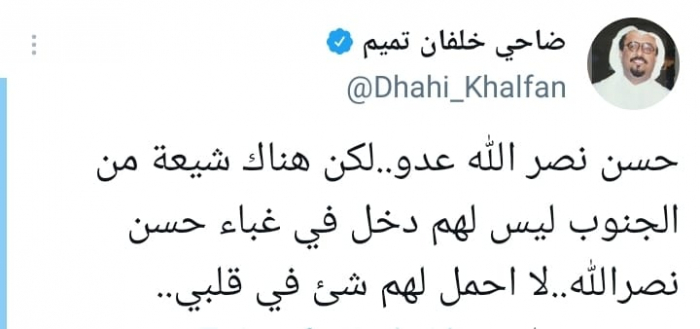 وقال في تغريدة على حسابه بموقع التدوين المصغر تويتر، اليوم إن: "حسن نصر الله عدو..لكن هناك شيعة من الجنوب ليس لهم دخل في غباء حسن نصرالله، لا أحمل لهم شئ في قلبي".