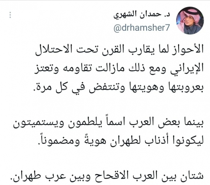 وأشار في تغريدة على حسابه بموقع التدوين المصغر تويتر، اليوم إلى أن: "الأحواز لما يقارب القرن تحت الاحتلال الإيراني ومع ذلك مازالت تقاومه وتعتز بعروبتها وهويتها وتنتفض في كل مرة".