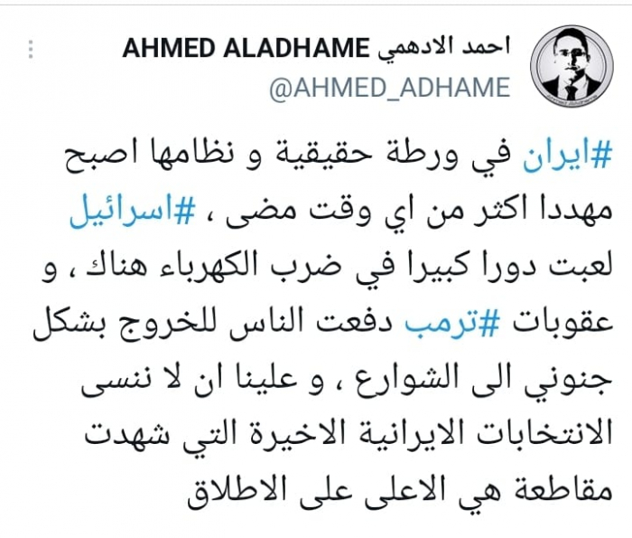 وأشار إلى أن: "إسرائيل لعبت دورا كبيرا في ضرب الكهرباء هناك، وعقوبات ترمب دفعت الناس للخروج بشكل جنوني إلى الشوارع".