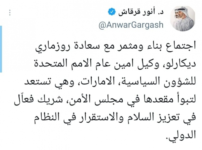 وكشف في تغريدة على حسابه بموقع التدوين المصغر تويتر، اليوم عن: "اجتماع بناء ومثمر مع سعادة روزماري ديكارلو، وكيل أمين عام الامم المتحدة للشؤون السياسية".