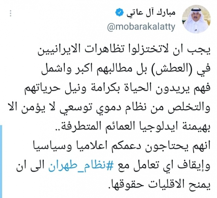 رفض الكاتب والباحث مبارك آل عاتي، اختزال مطالب الإيرانيين من نظام الملالي في توفير المياه، وأشار إلى أن الشعب يطالب بالحرية والحياة الكريمة، وإسقاط النظام.