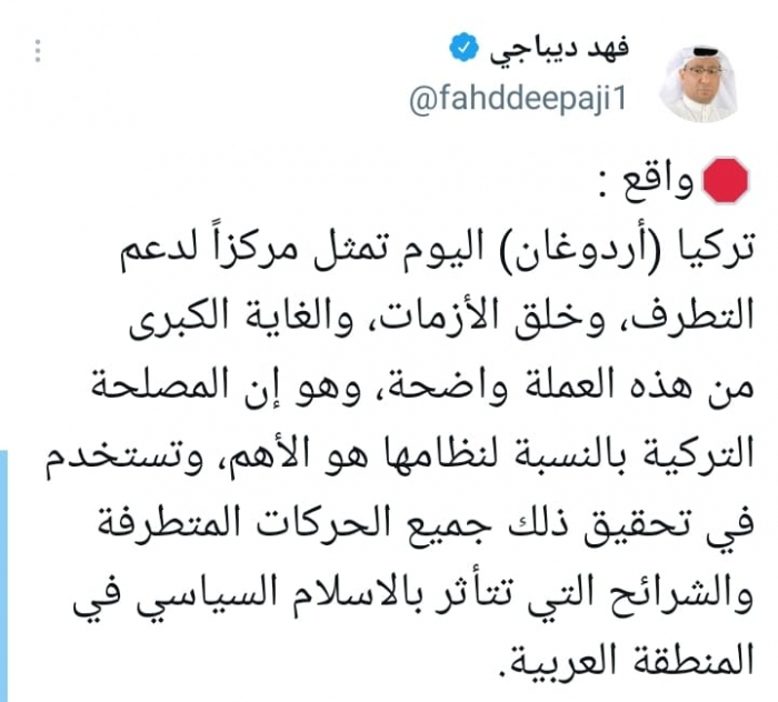 وصف المحلل السياسي فهد ديباجي تركيا بأنها بؤرة للتطرف في المنطقة، تستخدم الإسلام السياسي لتحقيق مصالحها.