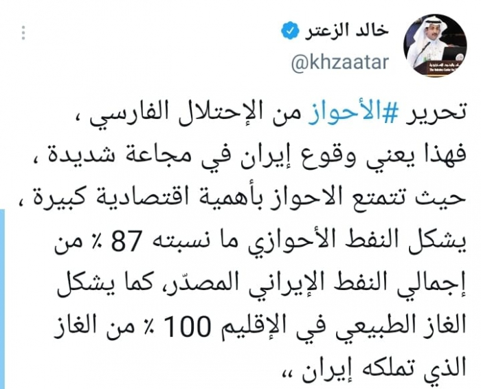 وأكد في تغريدة على حسابه بموقع التدوين المصغر تويتر، اليوم أن: "تحرير الأحواز من الاحتلال الفارسي، فهذا يعني وقوع إيران في مجاعة شديدة".