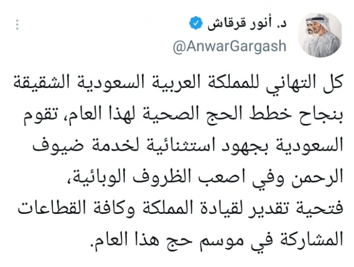 هنأ الدكتور أنور قرقاش المستشار الدبلوماسي لرئيس دولة الإمارات العربية المتحدة، القيادة في المملكة العربية السعودية بنجاح تنظيم موسم الحج.
