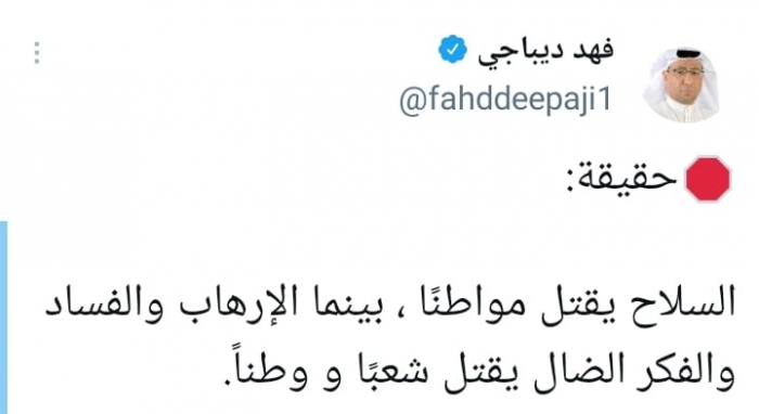 وقال في تغريدة على حسابه بموقع التدوين المصغر تويتر، اليوم إن: "السلاح يقتل مواطنًا، بينما الإرهاب والفساد والفكر الضال يقتل شعبًا ووطنًا".