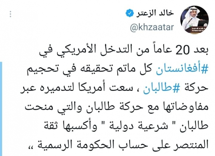 وأوضح في تغريدة على حسابه بموقع التدوين المصغر تويتر، اليوم أن: "بعد 20 عاماً من التدخل الأمريكي في أفغانستان كل ماتم تحقيقه في تحجيم حركة طالبان، سعت أمريكا لتدميره عبر مفاوضاتها مع حركة طالبان".