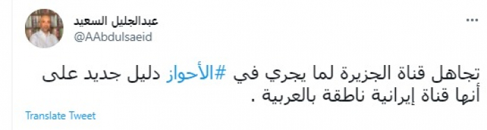 وقال في تغريدة عبر "تويتر" رصدها "المشهد العربي": "تجاهل قناة الجزيرة لما يجري في الأحواز دليل جديد على أنها قناة إيرانية ناطقة بالعربية".