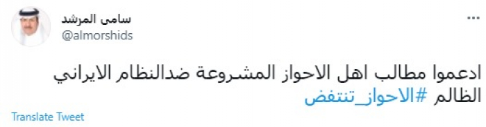 وقال في تغريدة عبر "تويتر" رصدها "المشهد العربي": "ادعموا مطالب أهل الأحواز المشروعة ضد النظام الإيراني الظالم.. الأحواز تنتفض".