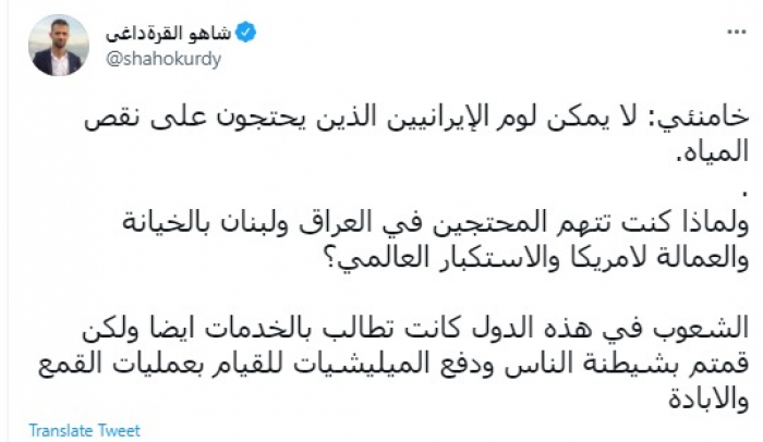 علق الكاتب الصحفي العراقي شاهو القرةداغي، اليوم الجمعة، على تصريحات المرشد الإيراني علي خامنئي، بشأن انتفاضة المياه بالأحواز وبعض المدن الإيرانية.