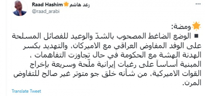 وقال في تغريدة عبر "تويتر" رصدها "المشهد العربي": "الوضع الضاغط المصحوب بالشدّ والوعيد للفصائل المسلحة على الوفد المفاوض العراقي مع الأمريكان".