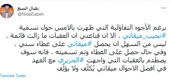 وقال في تغريدة عبر "تويتر" رصدها "المشهد العربي": "برغم الأجواء التفاؤلية التي ظهرت بالأمس حول تسمية نجيب ميقاتي، إلا أن قناعتي أن العقبات ما زالت قائمة".