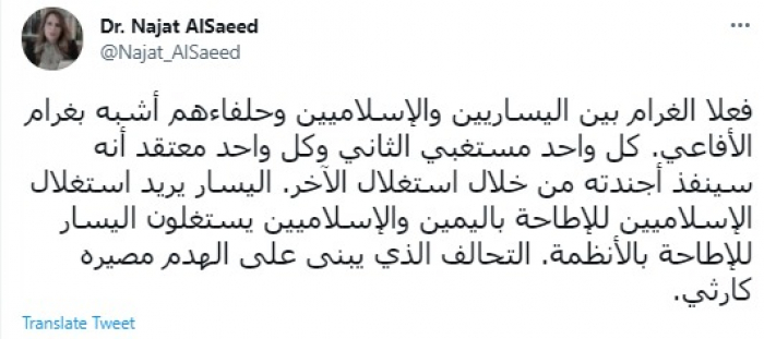 وقالت في تغريدة عبر "تويتر" رصدها "المشهد العربي": "فعلا الغرام بين اليساريين والإسلاميين وحلفاءهم أشبه بغرام الأفاعي. كل واحد مستغبي الثاني وكل واحد معتقد أنه سينفذ أجندته من خلال استغلال الآخر".