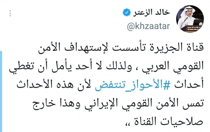 شدد المحلل السياسي خالد الزعتر، على أن قناة الجزيرة القطرية تستهدف الأمن العربي، مشيرا إلى تهربها من تغطية الأحداث في الأحواز العربية.