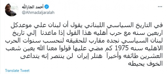 وقال في تغريدة عبر "تويتر" رصدها "المشهد العربي": "في التاريخ السياسي اللبناني يقول أن لبنان علي موعد كل 40 سنة مع حرب أهلية هذا القول إذا ما عدنا إلي تاريخ لبنان السياسي نجده مقارب للحقيقة لنحسب سنوات الحرب الاهليه سنه 1975 كم مضي عليها قولوا معنا".