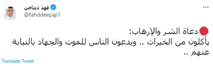 وقال في تغريدة عبر "تويتر" رصدها "المشهد العربي": "دعاة الشر والإرهاب: يأكلون من الخيرات .. ويدعون الناس للموت والجهاد بالنيابة عنهم".