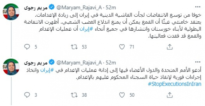 وأضافت: أظهرت الانتفاضة البطولية لأبناء خوزستان وانتشارها في جميع أنحاء إيران أن عمليات الإعدام والقمع قد فقدت فعاليتها".
