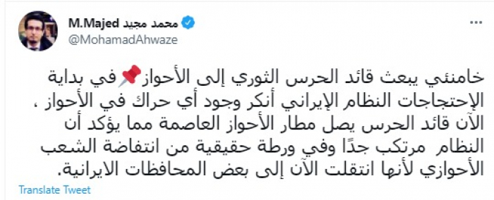 وكتب في تغريدة عبر "تويتر" رصدها "المشهد العربي": "خامنئي يبعث قائد الحرس الثوري إلى الأحواز في بداية الاحتجاجات النظام الإيراني أنكر وجود أي حراك في الأحواز، الآن قائد الحرس يصل مطار الأحواز العاصمة".