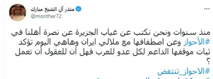 وكتب في تغريدة عبر "تويتر" رصدها "المشهد العربي": "منذ سنوات ونحن نكتب عن غياب الجزيرة عن نصرة أهلنا في الأحواز وعن اصطفافها مع ملالي ايران وهاهي اليوم تؤكد ثبات موقفها الداعم لكل عدو للعرب فهل آن للعقول أن تعمل؟".