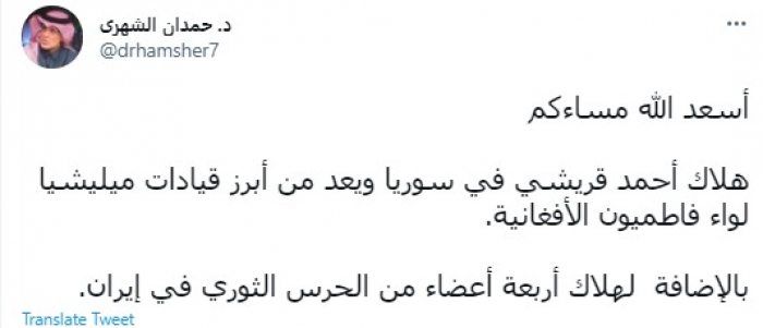 وقال في تغريدة عبر "تويتر" رصدها "المشهد العربي": "هلاك أحمد قريشي في سوريا ويعد من أبرز قيادات ميليشيا لواء فاطميون الأفغانية.. بالإضافة لهلاك أربعة أعضاء من الحرس الثوري في إيران".