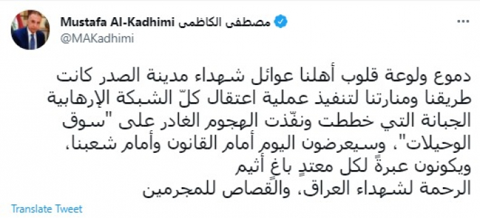 وقال في تغريدة عبر "تويتر" رصدها "المشهد العربي": "دموع ولوعة قلوب أهلنا عوائل شهداء مدينة الصدر كانت طريقنا ومنارتنا لتنفيذ عملية اعتقال كلّ الشبكة الإرهابية الجبانة التي خططت ونفّذت الهجوم الغادر على سوق الوحيلات".