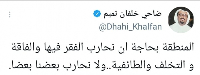وأوضح في تغريدة على حسابه بموقع التدوين المصغر تويتر، اليوم أن: "المنطقة بحاجة أن نحارب الفقر فيها والفاقة والتخلف والطائفية.. ولا نحارب بعضنا بعضا".
